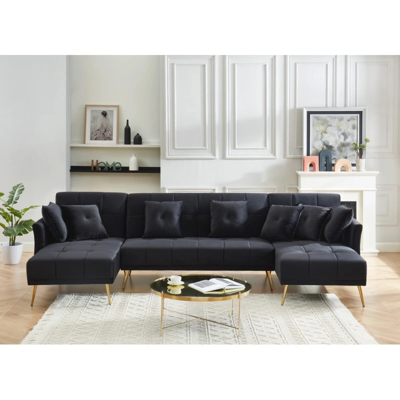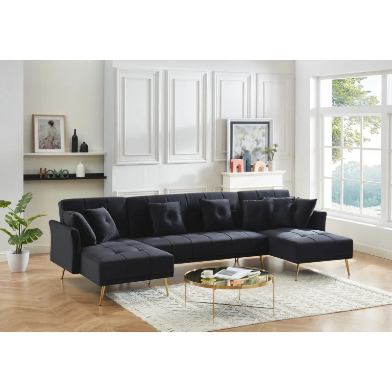 Pour un intérieur chic et élégant craquez pour le canapé panoramique AROMA 6 places ! Laissez vous séduire par ses détails capitonnés, ses pieds dorés et son velours.