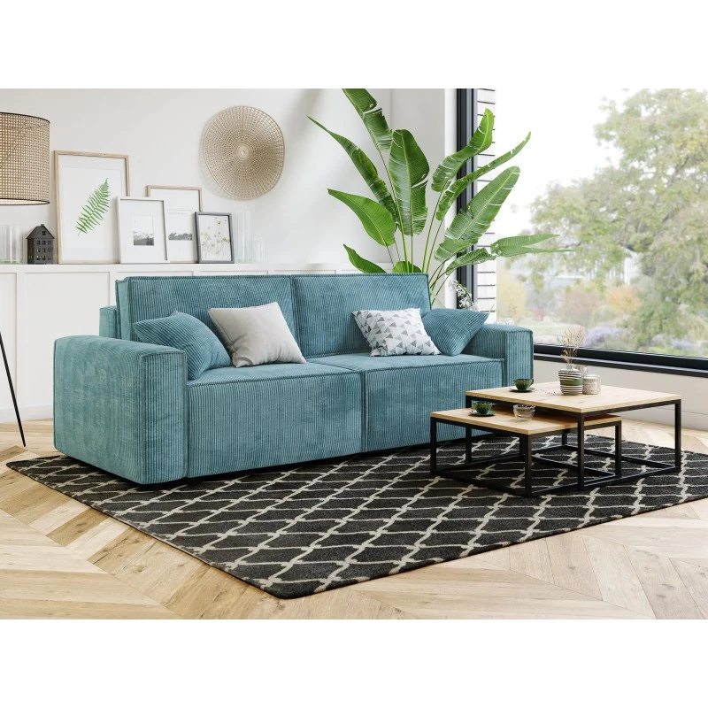 Son revêtement en velours côtelé, ses accoudoirs carrés et son format généreux sont ses vrais atouts tendance.