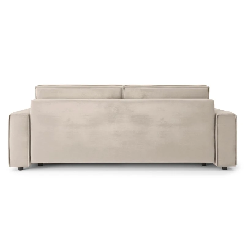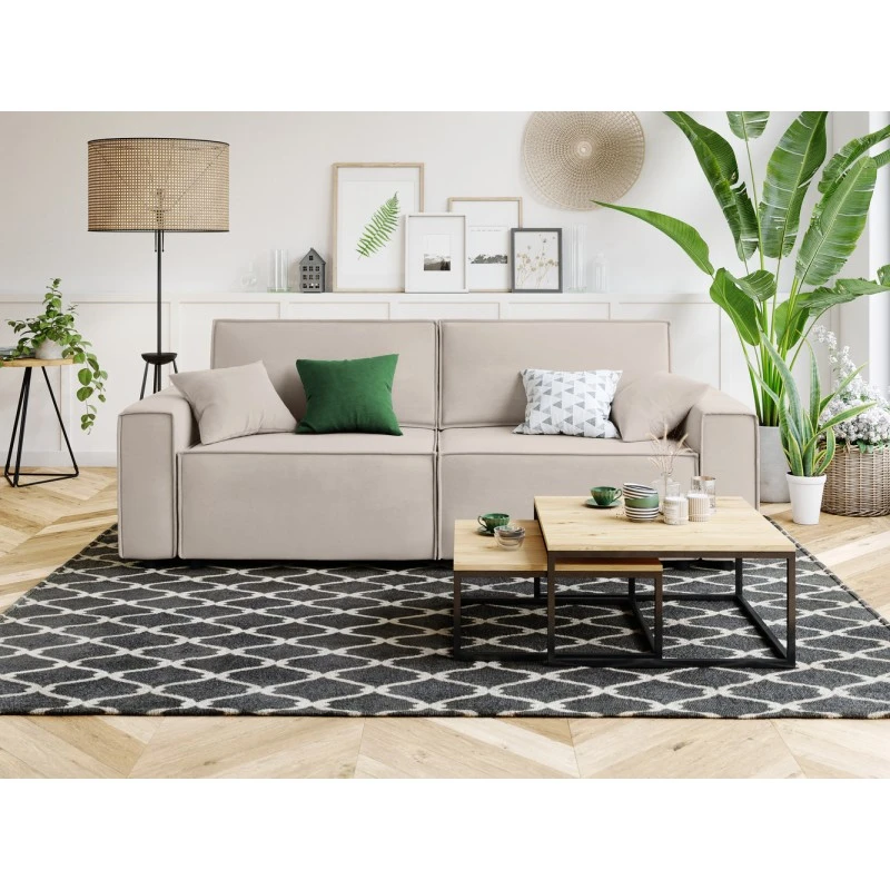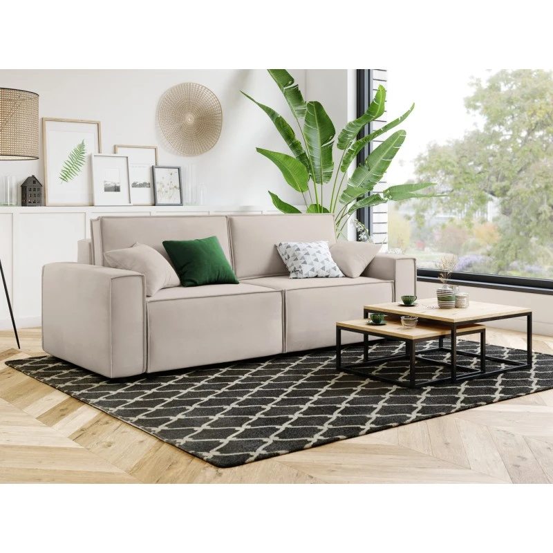 Son revêtement en velours, ses accoudoirs carrés et son format généreux sont ses vrais atouts tendance.