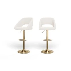 Lot De 2 Tabourets De Bar LENNY En Tissu Bouclette Blanc Piètement En Métal Doré