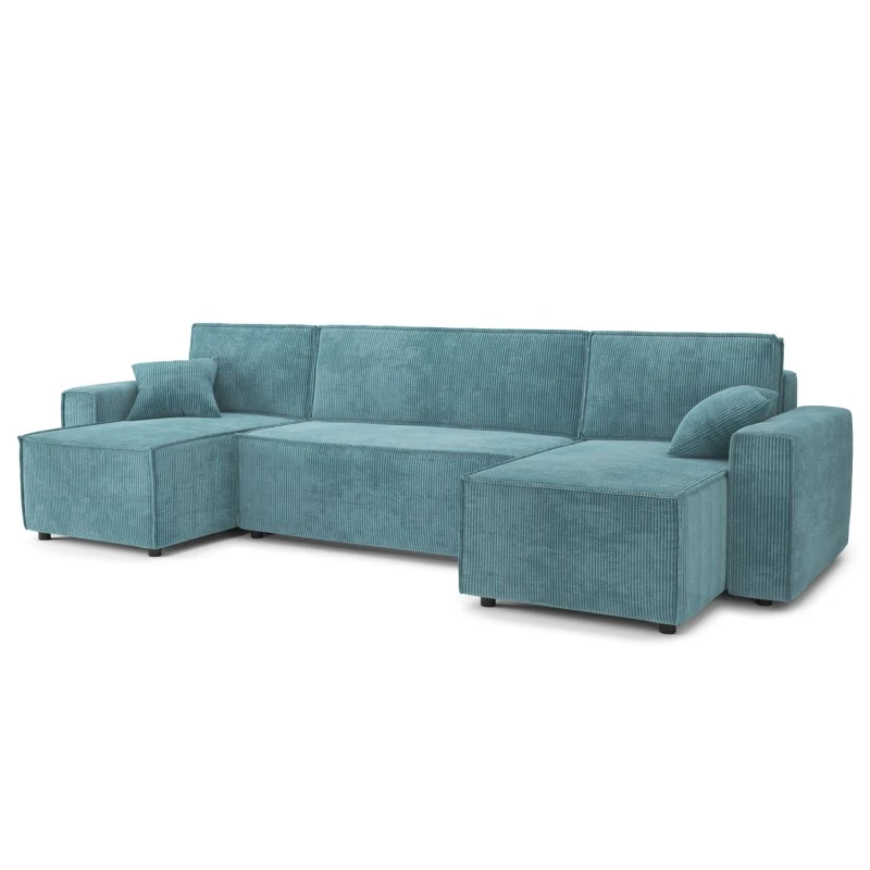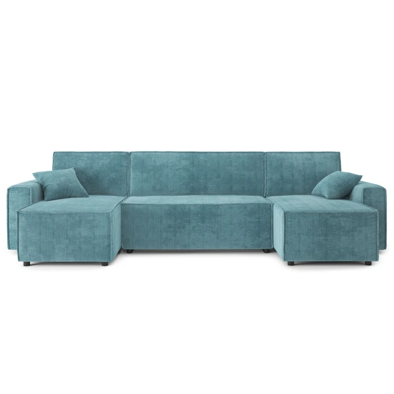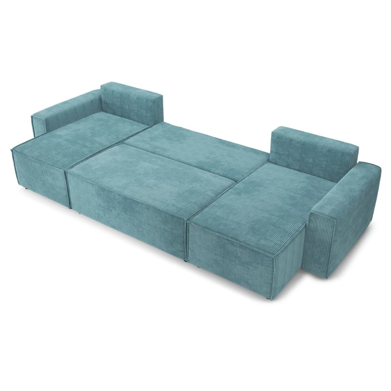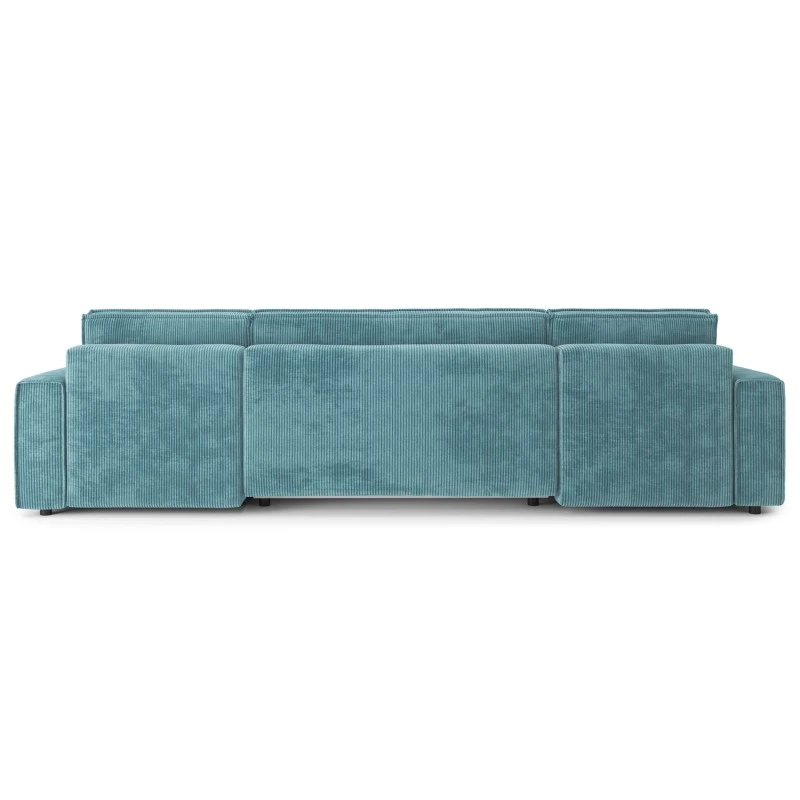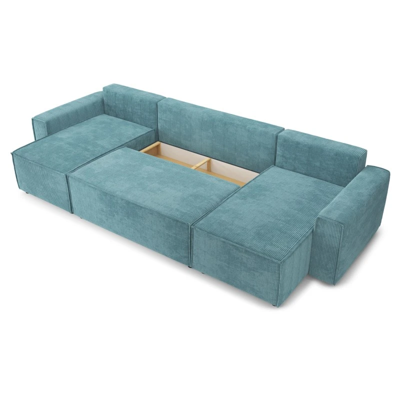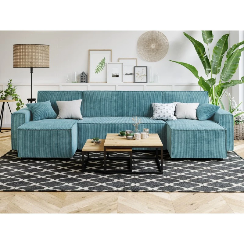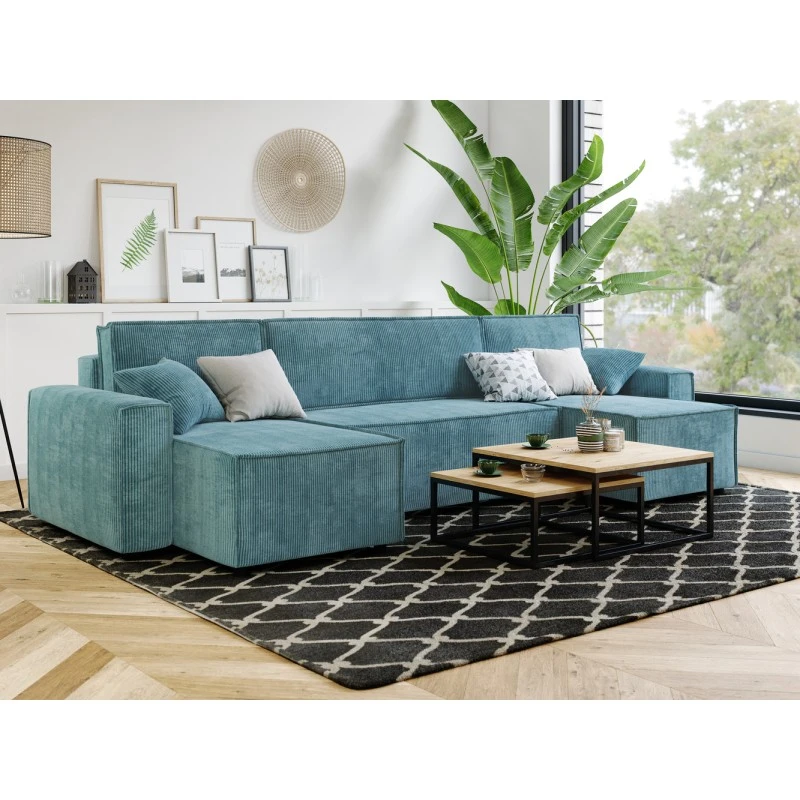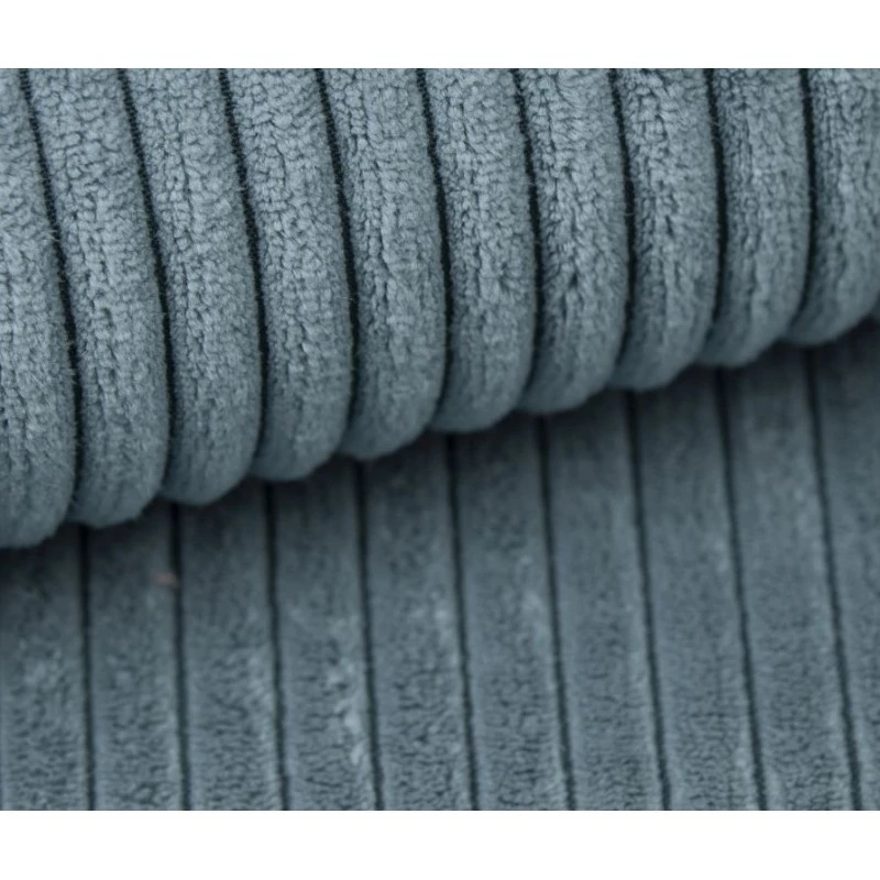Son revêtement en velours côtelé bleu, ses accoudoirs carrés et son format généreux sont ses vrais atouts tendance.