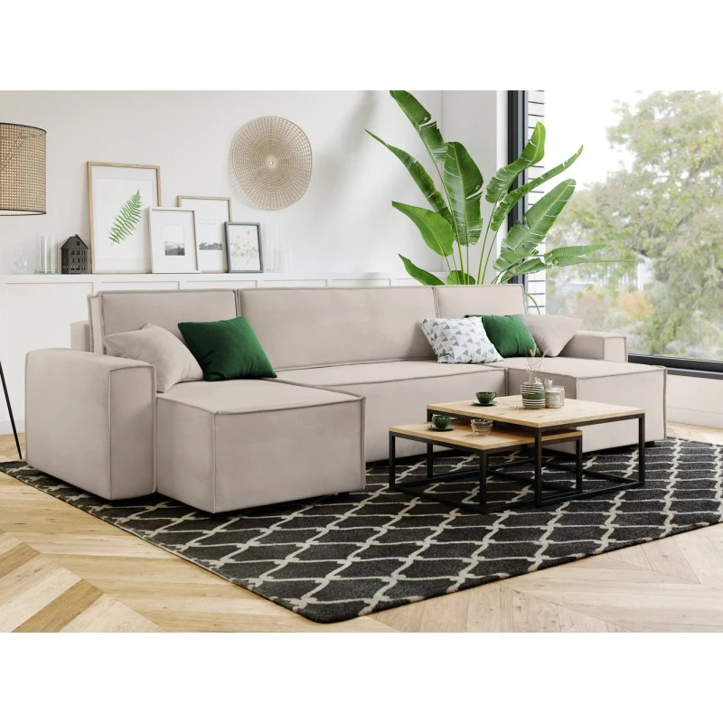 Son revêtement en velours grège, ses accoudoirs carrés et son format généreux sont ses vrais atouts tendance.