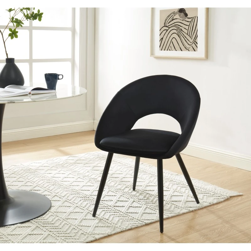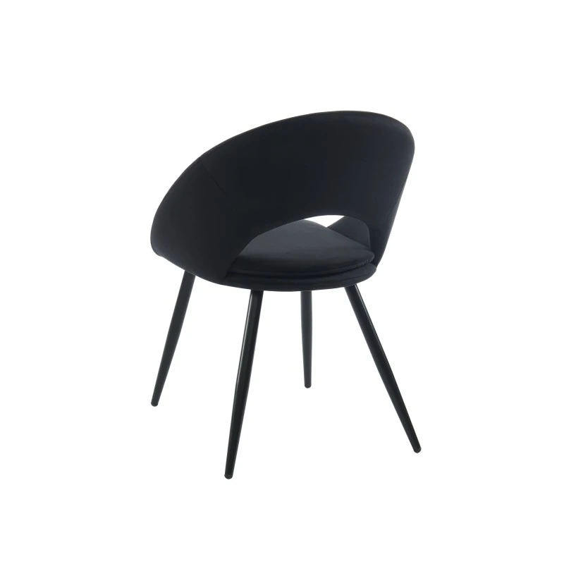 Optez pour un fauteuil de table au style vintage ! La chaise LEONIE vous surprendra avec son design tout en rondeur, habillé de velours. Avec la chaise LEONIE, c’est une valeur sûre, elle conviendra à de nombreuses décorations avec son dossier incurvé en velours noir et ses pieds en métal noir, que ce soit autour d’une table à manger ou pour accompagner votre bureau…