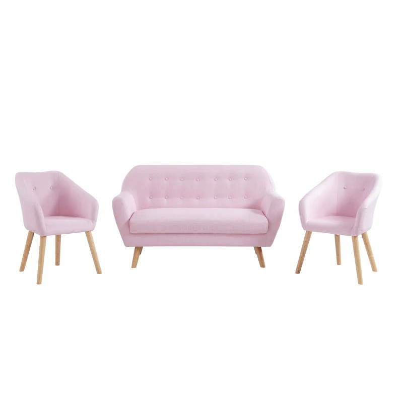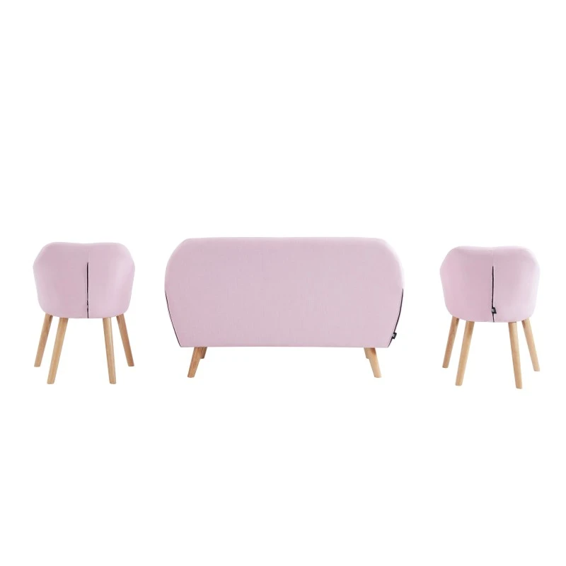 Ensemble composé d’un canapé HILDA 144 x 65 x 84 cm et de deux fauteuils HILDA 59 x 57 x 80 cm. Style scandinave. Pieds en bois d’hévéa. Revêtement en tissu rose.