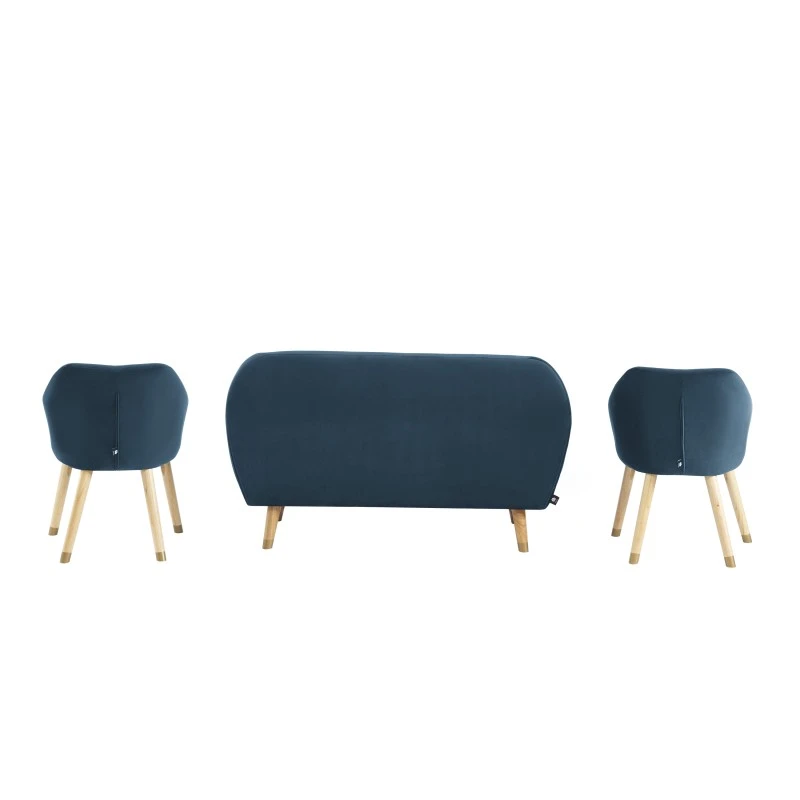 Ensemble HILDA En Velours Bleu Avec Piètement Bois Et Doré 1 Canapé Et 2 Fauteuils