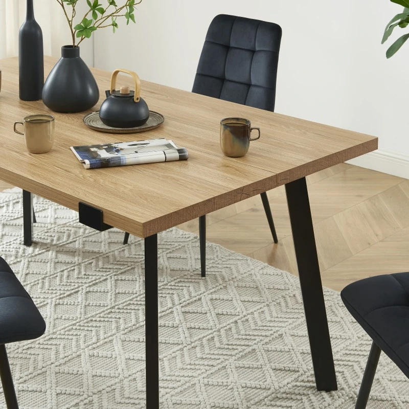 – Table : plateau en MDF et mélaminé effet chêne, pieds en métal noir