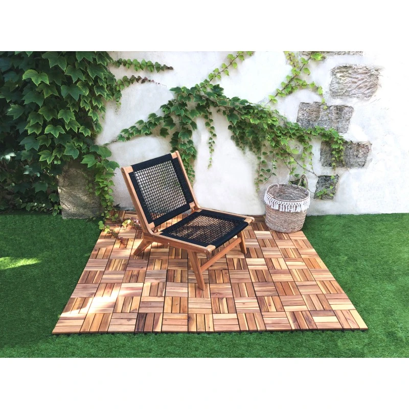 Optez pour les dalles en bois d’acacia huilé avec sa finition en mosaïque pour donner du charme à votre extérieur.