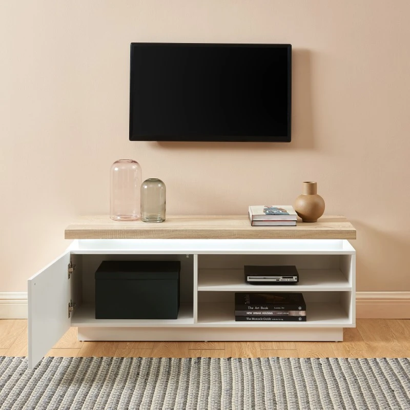 Pour finir, on tombe sous le charme de ce revêtement laqué blanc brillant, ainsi que de ce plateau effet chêne clair, donnant à ce meuble TV un style à la fois contemporain et naturel.
