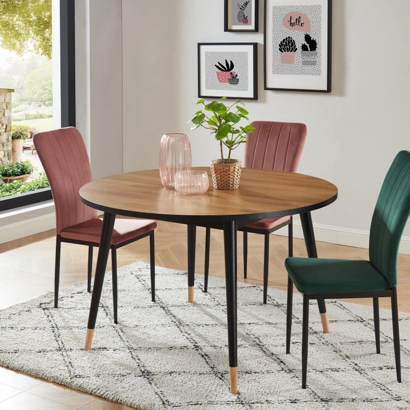 Table de séjour ronde CAVALLO – Structure en MDF – Revêtement mélaminé coloris bois et noir – Pieds en bois massif – Dimensions : L120 x P120 x H75 cm