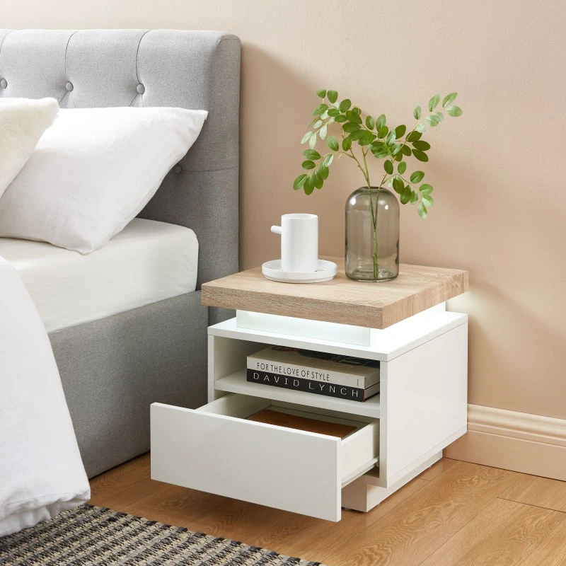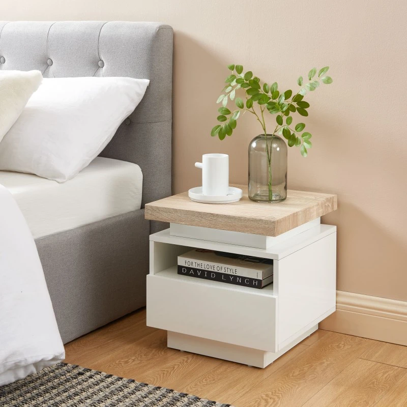 De forme cubique, cette dernière se glissera facile entre le lit et le mur. On apprécie sa niche et son tiroir, vous permettant de ranger facilement vos affaires.