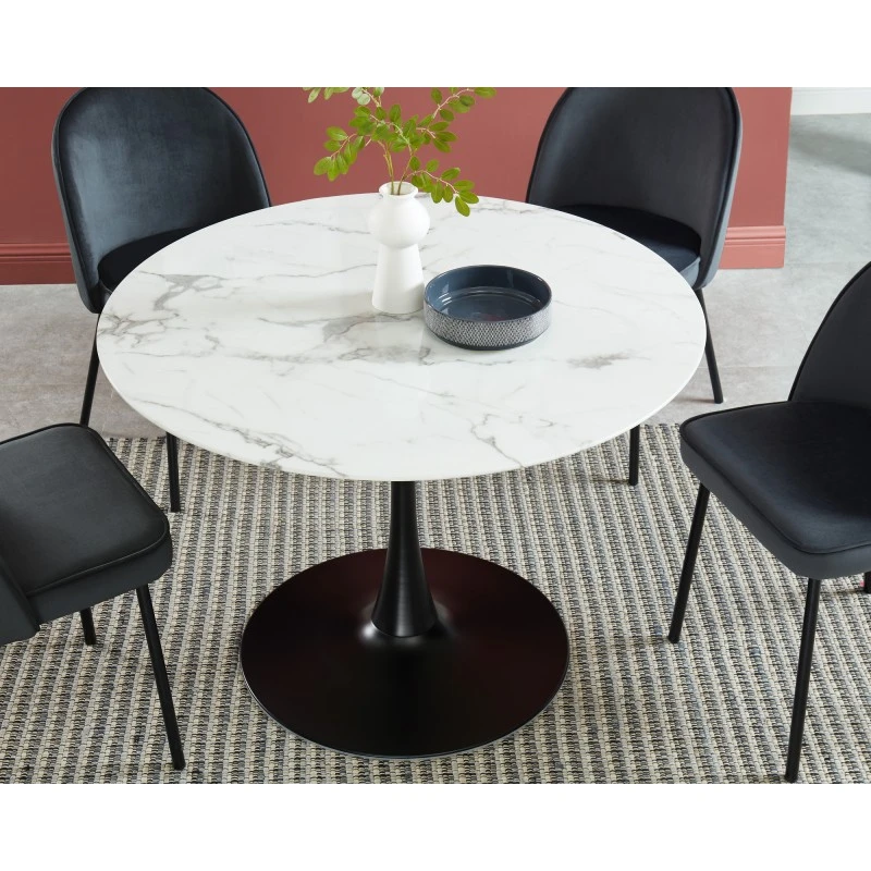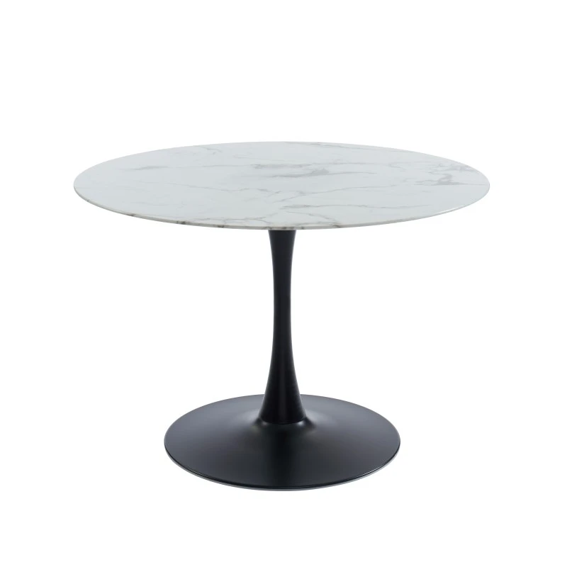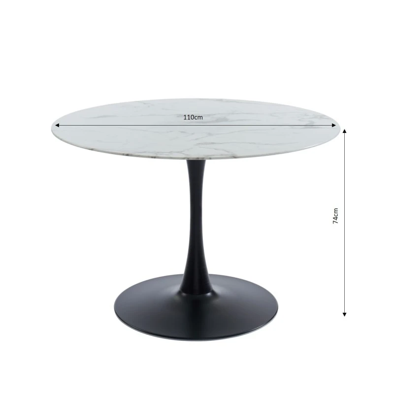 Table à manger MONIKA – Plateau rond en verre trempé avec technologie spéciale effet marbre – Pied en métal noir – Dimensions : D110 x H74cm