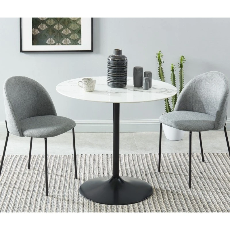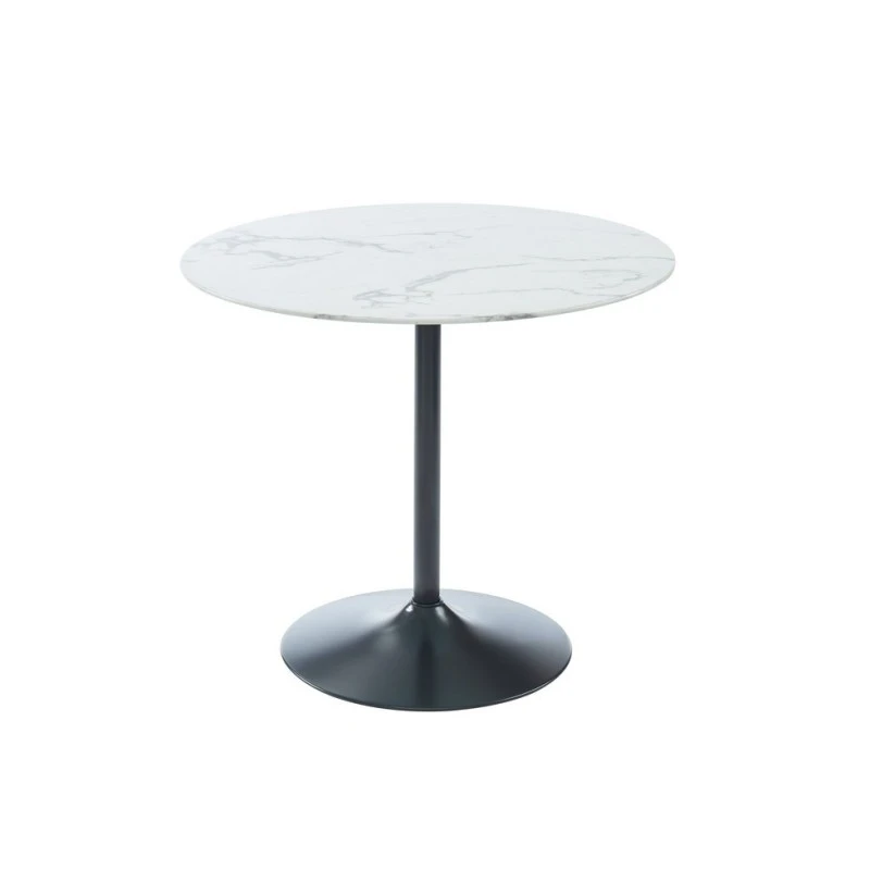 Table MONIKA 90cm – Style contemporain – Plateau en verre trempé effet véritable marbre – Piètement en métal laqué noir – Dimensions : D90 x H76cm